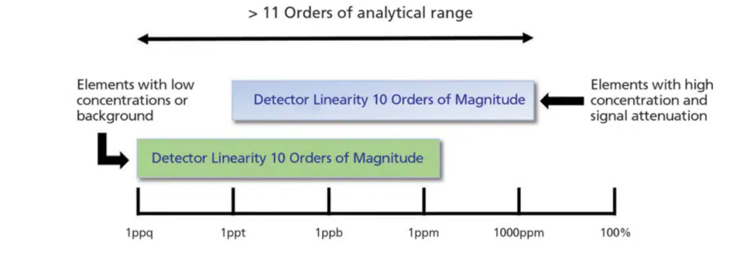 ICP-MS可以提供非常寬廣的線性動(dòng)態(tài)范圍,使分析元素的濃度范圍從個(gè)位數(shù)ppt到百位ppm,大多數(shù)儀器提供10個(gè)數(shù)量級(jí)的動(dòng)態(tài)范圍,相當(dāng)于檢測(cè)低至0.5 cps到近10 Gcps。如果進(jìn)一步的衰減主要元素的訊號(hào),例如鈉或鈣,可以再延伸其分析濃度范圍。